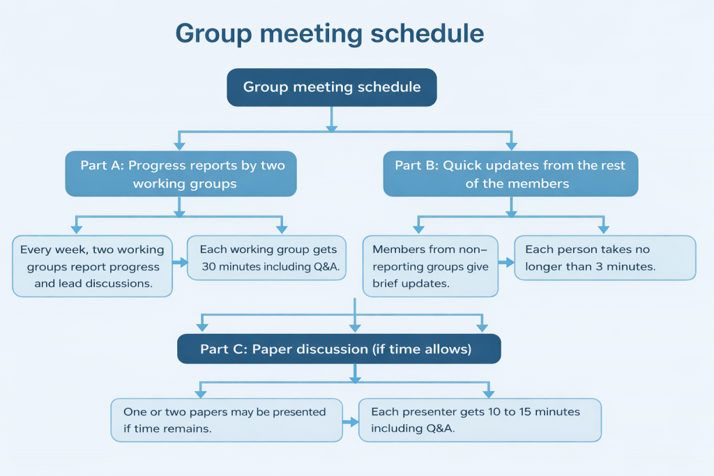 During the weekly group meeting, the captain of each working group will first provide a brief review (5–10 minutes) of the group’s current status, including recent progress and any challenges encountered. The remaining time will focus on discussing these challenges and exploring possible solutions. One or two members from the working group will help lead the discussion, and active participation from all members of the SMBH–galaxy group is expected.